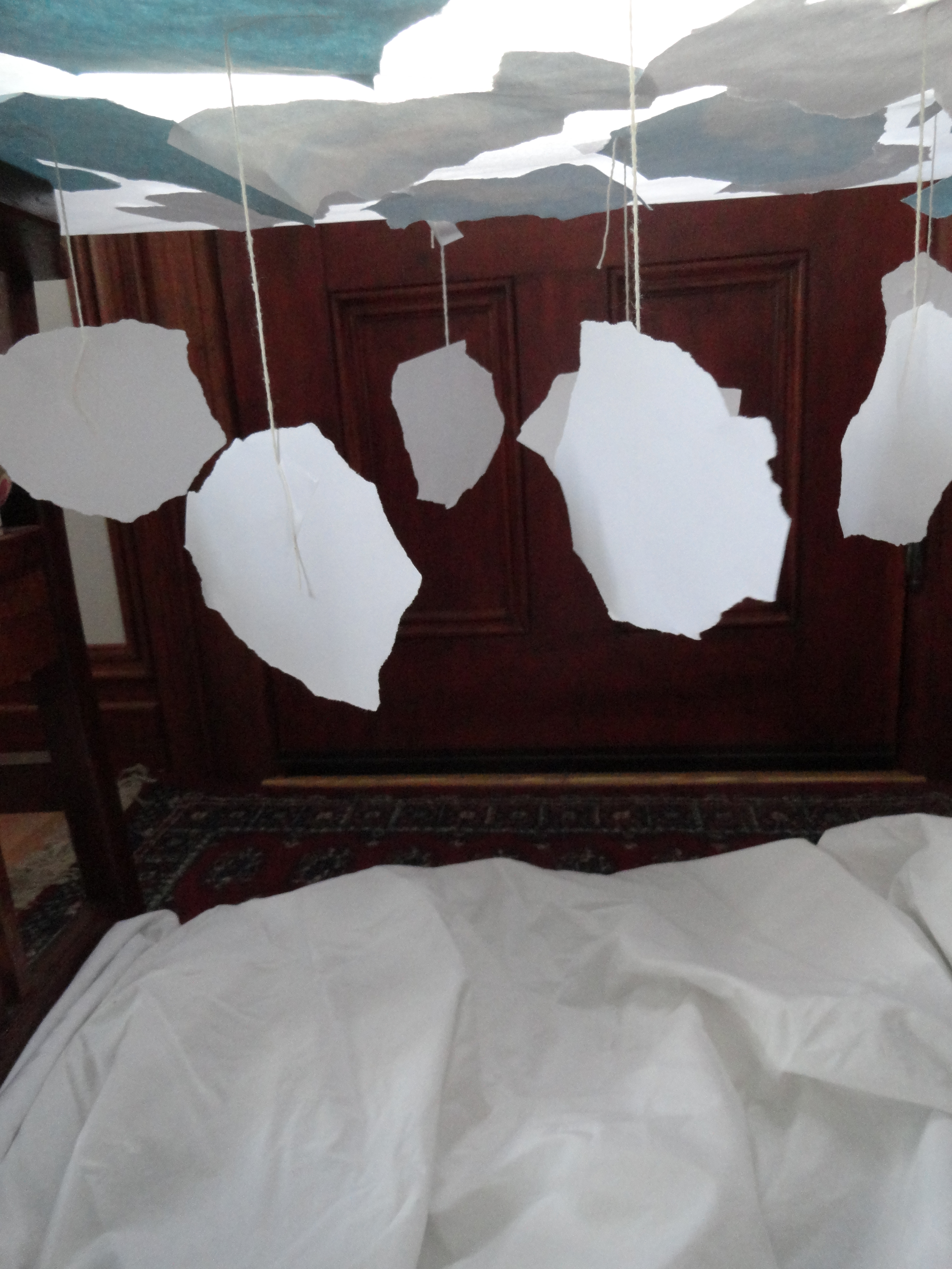5. Cloud Flip Mural Read Eric Carle’s Little Cloud. Go outside and see if you can see different things in the clouds. The Little CloudDiscuss how clouds can be all kinds of shapes. Give out two sheets of paper one small and one large. These can be white or cloud colors of your choice. Have children compare the sizes. Then have them cut out a cloud shape from each. Challenge older children by having them tear out the shapes. Ask: “Is one cloud bigger?” “Why or why not?” “Could you make other sizes from the left over pieces?” Add more math by having them put their clouds in size order, and count how many clouds the class made using multiples in the upper grades. Have children take turns gluing their larger clouds to a long sheet of paper – this can be white, painted in sky colors by the children, or be a long piece of tracing paper. The translucence of tracing paper creates a glowing sky effect. Attach a string to the smaller clouds using scotch tape. Tape these to the mural.  NOW: Take the two ends and flip it over. The clouds on strings will hang down. Suspend it between two tables by taping each end to the edge. Put fluffy pillows underneath and create a place for children to curl up with a book and dream or count clouds.